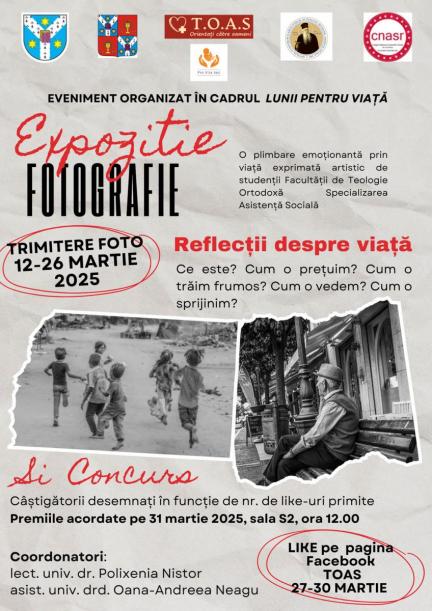 În perioada 12-26 martie 2025, studenții de la specializarea Asistență Socială au fost îndrumați de coordonatorii proiectului, maica lect. univ. dr. Polixenia Nistor și asist. univ. drd. Oana-Andreea Neagu, să înscrie maximum trei fotografii în concurs. În perioada 27-30 martie 2025, publicul a avut ocazia să aprecieze imaginile expuse și să participe activ la alegerea câștigătorilor. În intervalul menționat, s-au înscris 11 participanți, cu un număr total de 33 de fotografii, fiecare reflectând o viziune unică asupra vieții.